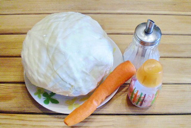 Для приготовления бессолевого квашеного продукта, потребуется всего 3 составляющих: капуста (белокочанная), морковь и вода (кипяченая, охлажденная).